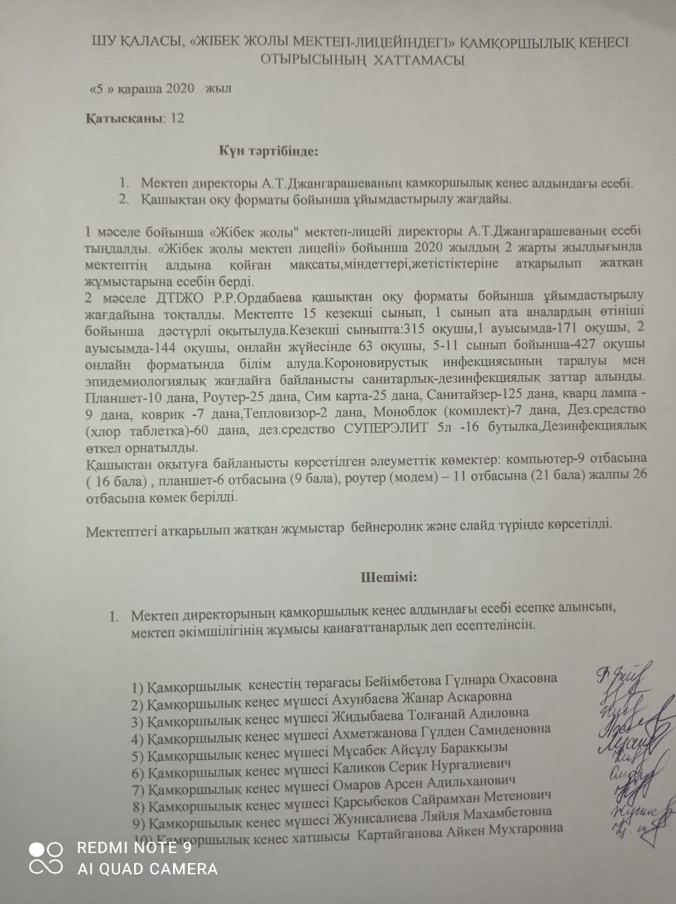 Шу қаласы,"Жібек жолы мектеп -лицейі" 2020 жылдың 5 қарашасында мектеп-лицейі жанында құрылған Қамқоршылық кеңесі алдында мектеп директоры Джангарашева Ардақ Төлепбаевна 2020 жылдың 2 жарты жылдығы бойынша есебін берді.Лицейде атқарылып жатқан жұмыстарына, мақсат,міндеттері,