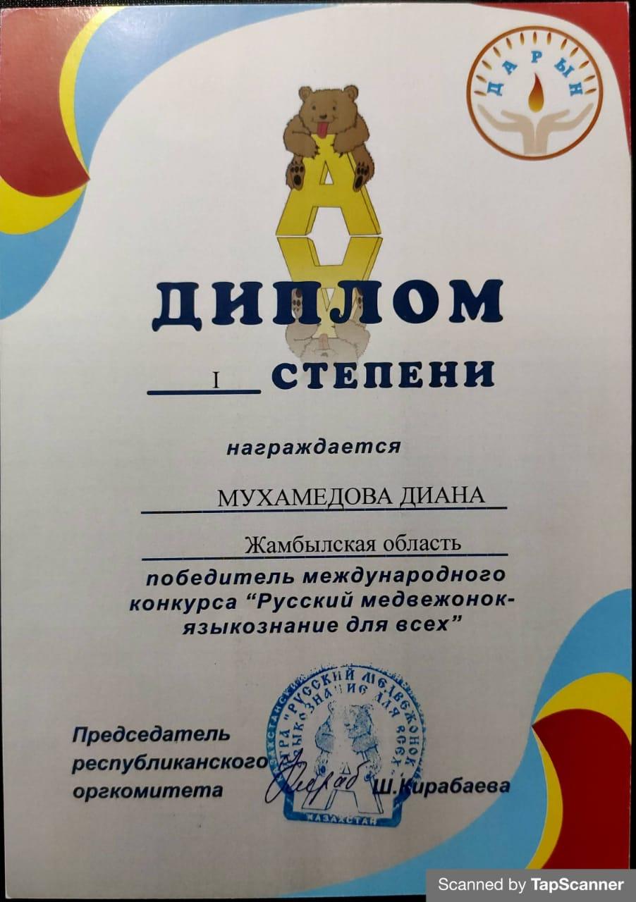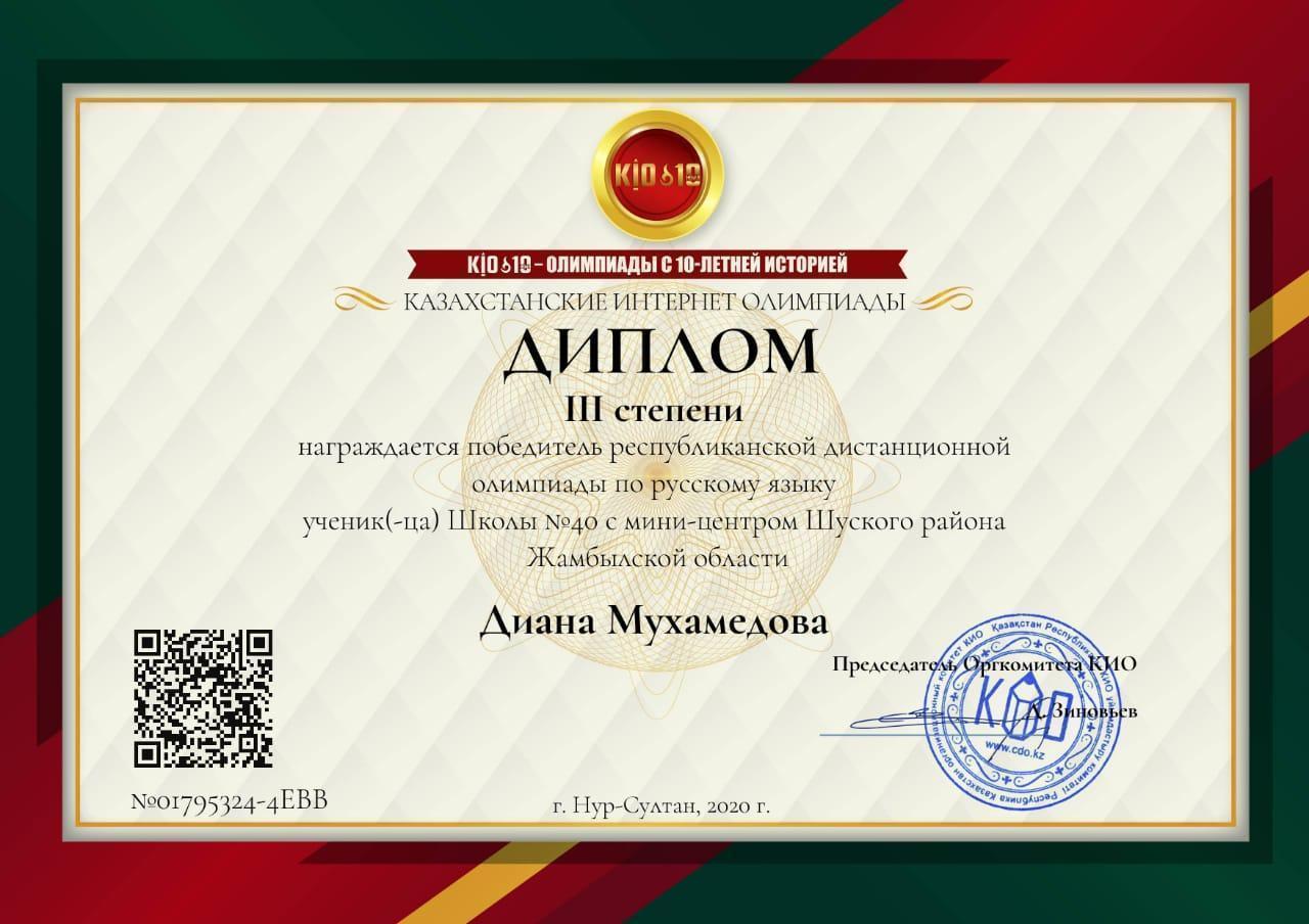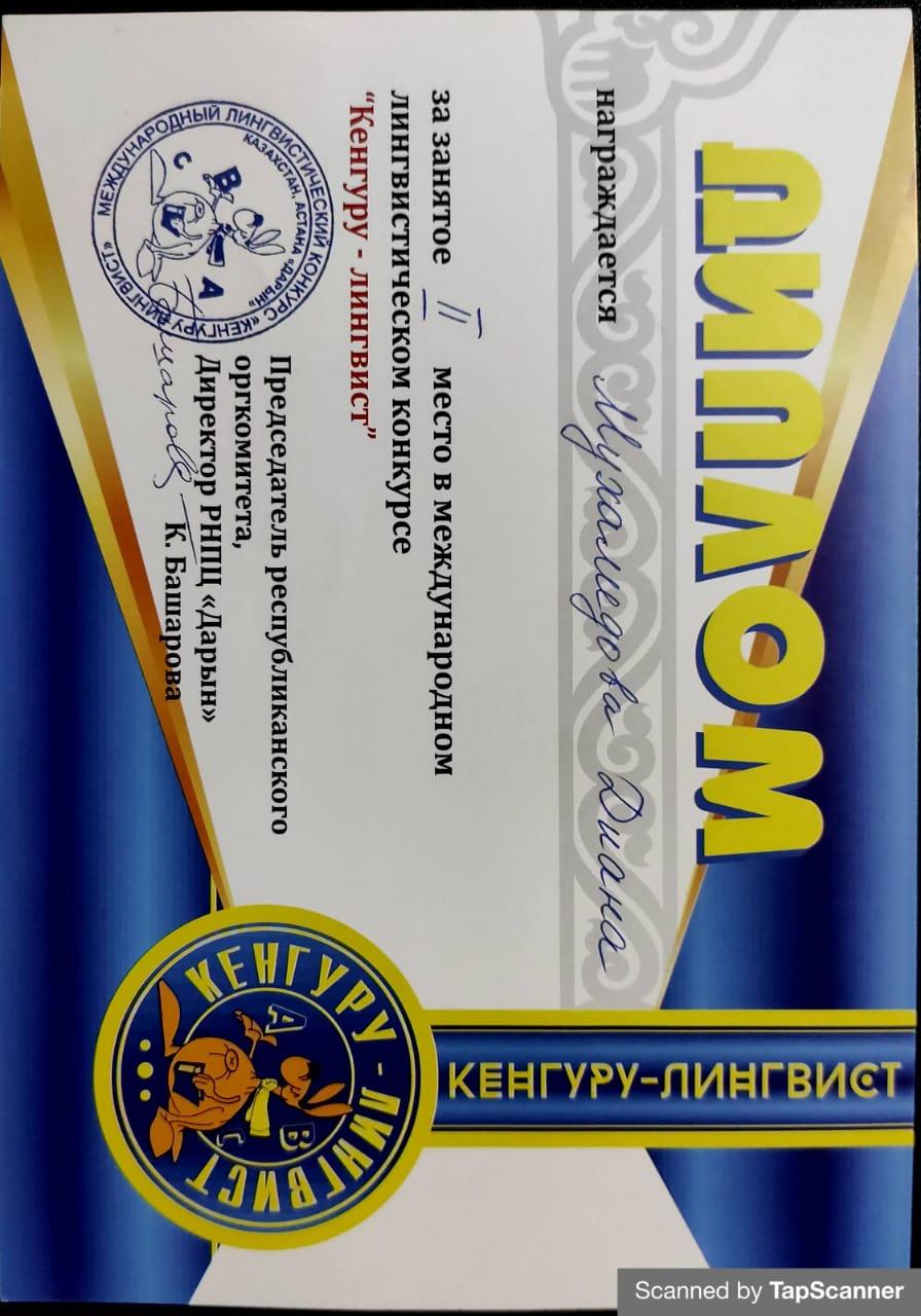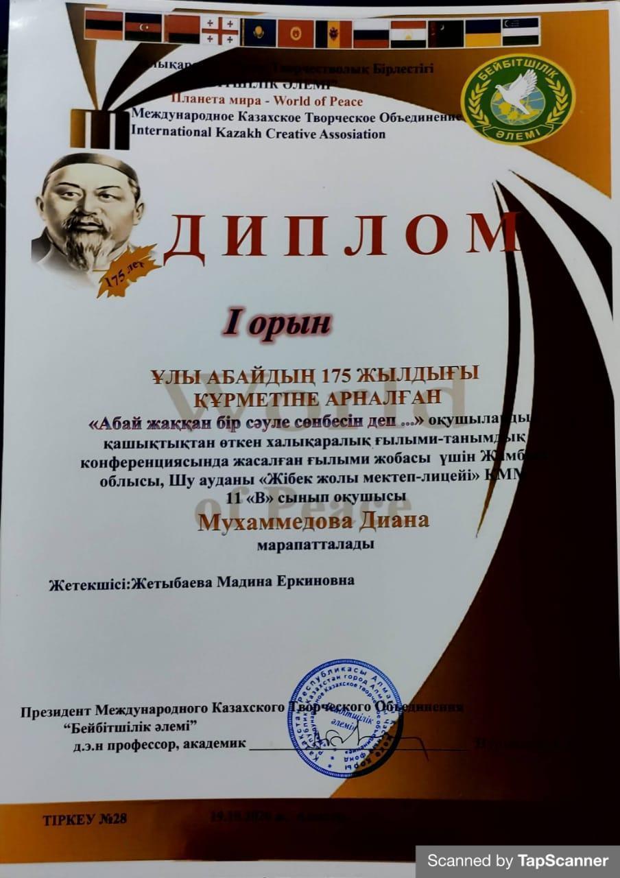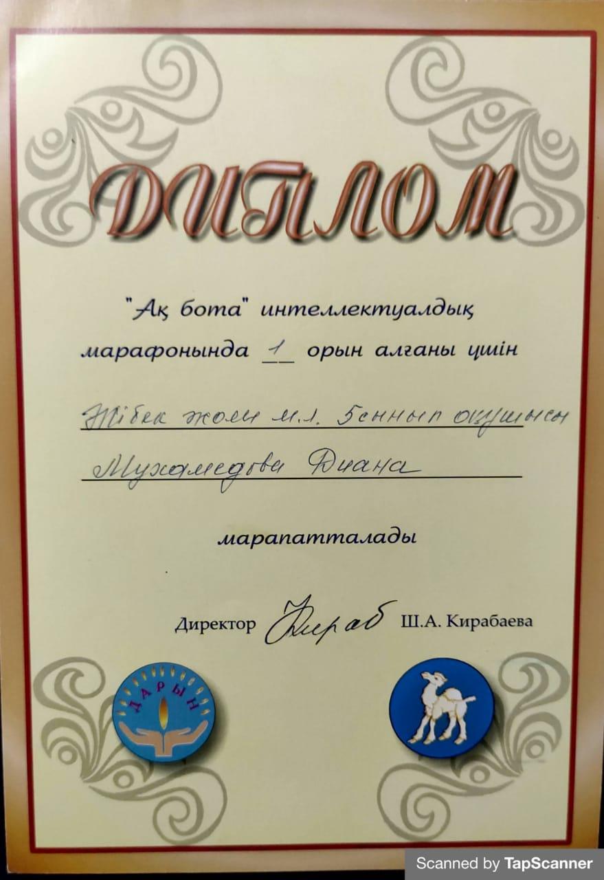 » » 2020-2021 оқу жылындағы 11-сынып оқушысы Мухамедова Диананың жетістіктері