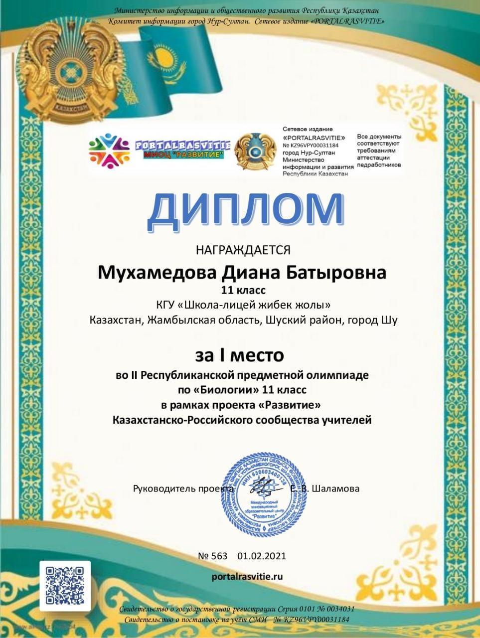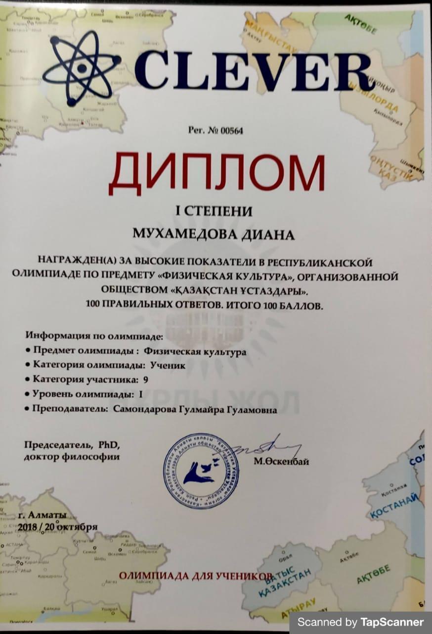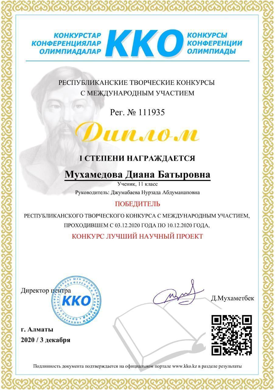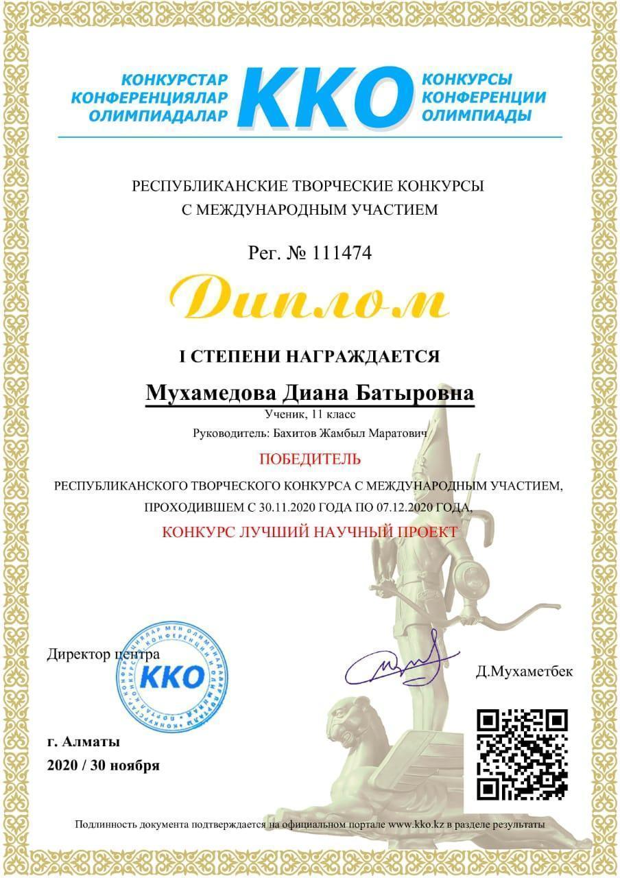 » » 2020-2021 оқу жылындағы 11-сынып оқушысы Мухамедова Диананың жетістіктері