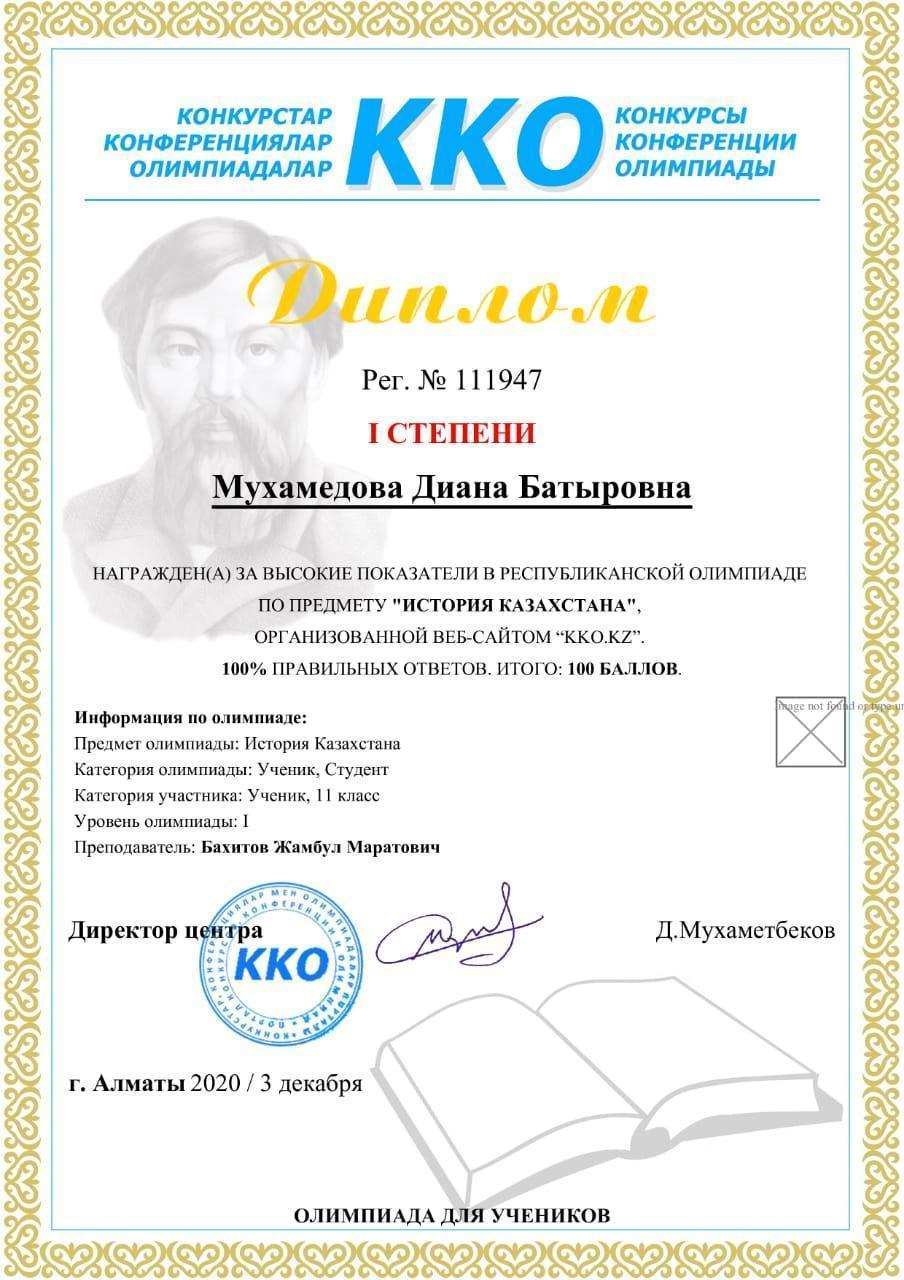 2020-2021 оқу жылындағы 11-сынып оқушысы Мухамедова Диананың жетістіктері