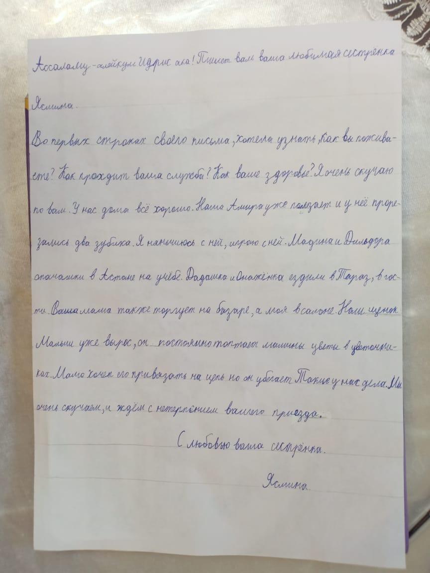 Бүгін «Жібек жолы» мектеп-лицейінің оқушылары ҚР Қарулы Күштерінің 30 жылдығына орай, «Сарбазға хат» әскери-патриоттық акциясы шеңберінде Қазақстан Қарулы Күштерінің мерзімді қызметтегі әскери қызметшілеріне қолына қаламын алып, Отан алдындағы міндетін атқарып жүрген сарбаздарға хат жазды. Хат жазған балалардың арасында туған ағалары да әскер қатарында қызмет атқарып жүр екен. Балалардың хаттары еліміздің кез келген әскери бөлімшесіндегі нақты мекен-жайға, іні-қарындастарының сәлемдемесі ретінде ағаларына жолданды.