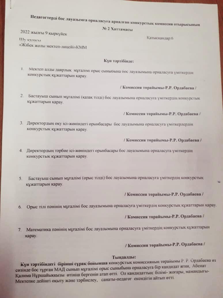 12 сентябрь 2022 0 1 2 3 4 5 "Жібек жолы мектеп-лицейінде" педагогтерді бос лауазымға орналасуға арналған конкурстық комиссия отырысы өтті.