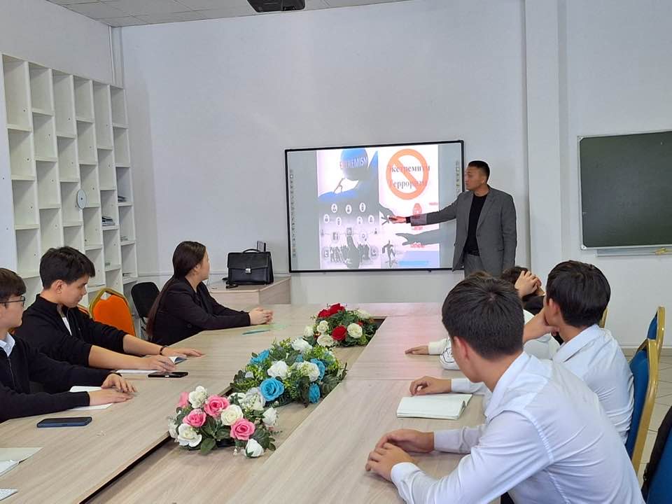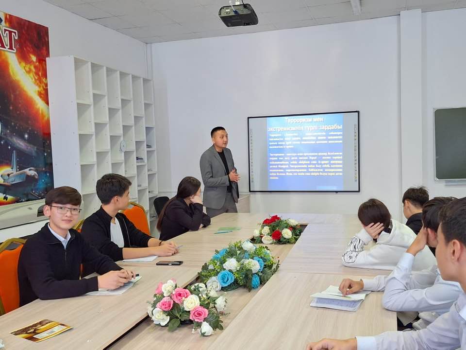 Қараша айының 27 күні тарих пәнінің мұғалімі Б.Демесбаев 9 сынып оқушыларымен "Терроризм мен экстремизмнің түрлі зардабы" тақырыбында дөңгелек үстел өткізді.Дөңгелек үстелдің өткізілу мақсаты жасөспірімдерге теріс пиғылдағы діни ағымдарды ажырата білуге, "Терроризм мен экстремизмнің" қоғамға тигізер зияны, еліміздің тыныштығын бұзатын қауіп-қатердің алдын алу болып табылады.