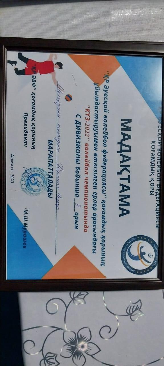 Жібек жолы мектеп-лицейі » Біз туралы » "ҚР әуес қой волейбол федерациясы"қоғамдық қорының ұйымдастыруымен өткен ерлер арасындағы "КҮЗ-2022" волейбол чемпионатында С ДИВИЗИОНЫ бойынша 2- орын Шу ауданы командасы Дүйсекен Ануар марапатталады