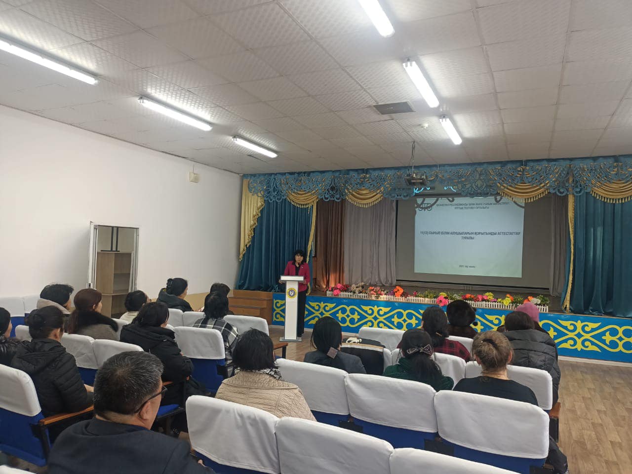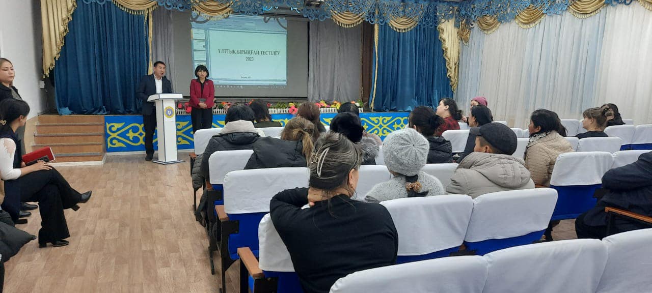 2022 жылдың желтоқсан айының 15-і күні 11-сынып мектеп бітіруші түлектердің ата-аналарымен бірлескен жиналыс өткізілді. Күн тәртібінде Қорытынды аттестаттау және ҰБТ-ның жаңа форматтағы өзгерістерімен таныстыру қарастырылды. Жиналыста мектеп директоры Г.Қ.Тұрлыбек сөз алып, ҰБТ-дағы пән мұғалімдері мен ата-ананың рөлі, жауапкершілігі туралы түйінді ойға тоқталды. Келесі сөзді директордың оқу ісі жөніндегі орынбасары Д.К.Бошанова алып, қорытынды аттестаттауды өткізу мерзімдері және ұлттық тестілеу орталығы дайындаған емтихан материалдарын жүктеу, сақтау және ашу туралы ережелердің ретімен хабардар ете отырып, 2023 жылға арналған ҰБТ-ның жаңа форматтағы өзгерістерімен ата-аналарды таныстырып, ата-аналардың сұрақтарына жауап берді.