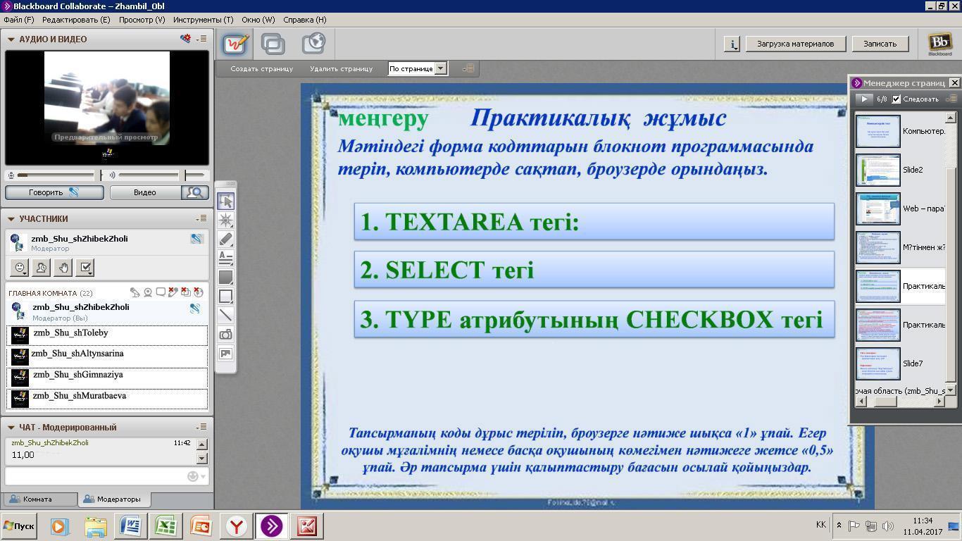 Сабақты 1.sabak.kz сайтының «Жамбыл обл» интерактвиті бөлмесінде, Елюминайт программасының көмегімен онлайн-режимінде өткіздім. Сабаққа Шу ауданынан 4 мектеп, Жамбыл облысы бойынша (Мерке, Қордай, Луговой) 7, Басқа облыстармен Алматы, Тараз, Атырау қалаларынан 9 мектеп қатысты. Шу қаласы мен ауданының көптеген мектептері интернет жүйесінінің нашарлығынан қатыса алмады.