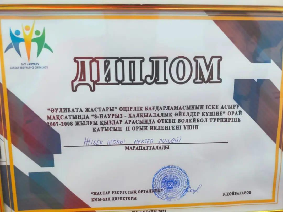 "8-наурыз халықаралық әйелдер күні мерекесіне орай, қыздар арасында өткен волейбол турнирінен, 17 мектеп ішінен оза шауып, жүлделі ІІ орынды иеленген