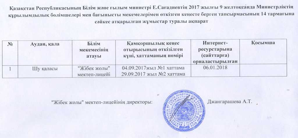 Қазақстан Республикасының Білім және ғылым министрі Е.Сағадиевтің 2017 жылғы 9 желтоқсанда Министрліктің құрылымдылық бөлімшелері мен бағынысты мекемелерімен өткізген кеңесте берген тапсырмасының 14 тармағына сәйкес атқарылған жұмыстар туралы ақпарат